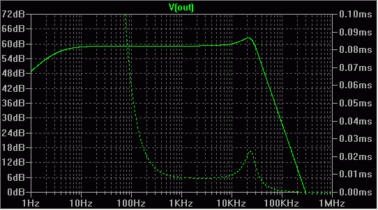Now, one graph which includes frequency domain aspect of the filter, but with the group delay instead of the phase. Seen this way, it is possible to understand the use of the bigger coupling caps. While at 20 Hz the amplitude roll-off is 0.1dB (even if speakers and room could reproduce it, it is inaudible), and while looking at the phase error situation is still not bad at all, things, however, are not so good if group delay is considered. This may be important, but again, this is only one side of the thing. Get back to the topic - this graph is about the peak in the group delay in the treble. It is directly related to the peak in the amplitude. Actually, since the FET does not affect this anyway, graph also shows the response of the circuit shown at the top of this page. |
